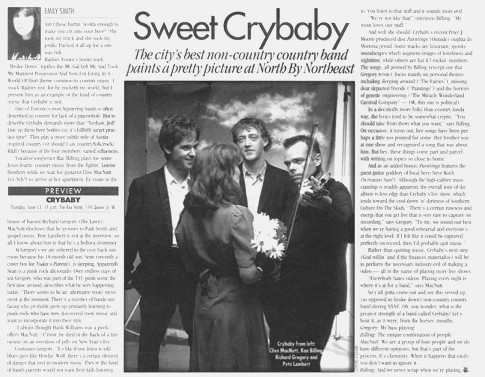 One of Toronto's most hipstering bands is often described as country for lack of a pigeonhole. But to describe Crybaby demands more than "Yeehaw, Jed! Line up them beer bottles cuz it's hillbilly target practice time!" They play a more subtle style of Austin-inspired country (or should I say country/folk/rock/R&B) because fo the four members' varied influences."